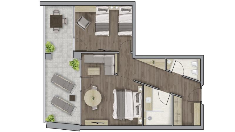 The suite comprises a spacious living room-bedroom combo with a double bed, a separate bedroom with twin beds, a bathroom with shower and separate toilet with bidet, a walk-in wardrobe and a wellness terrace with relaxation lounger. The suites enjoy partially an open view of the lake. Underground parking is included.